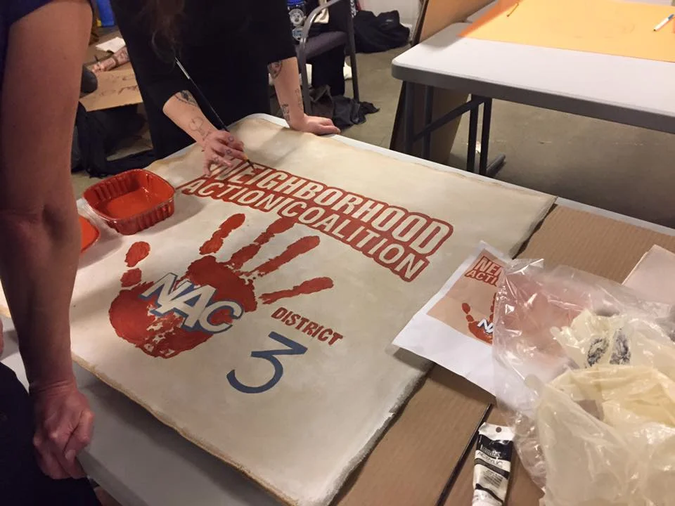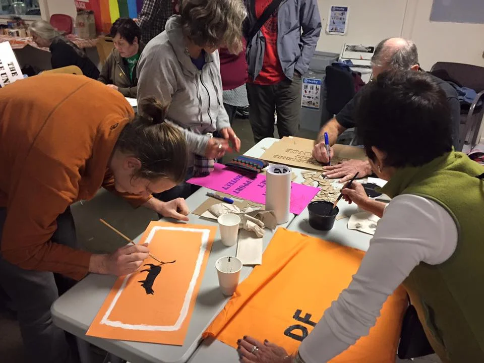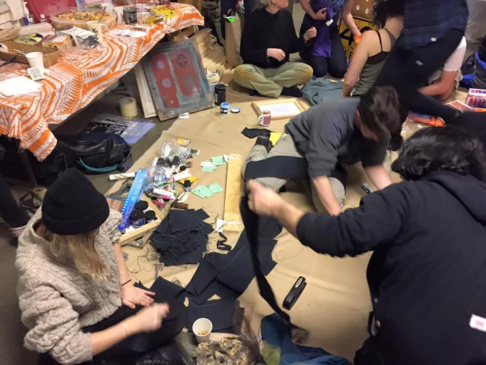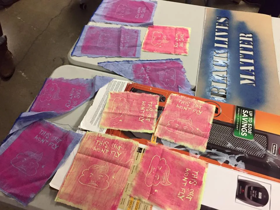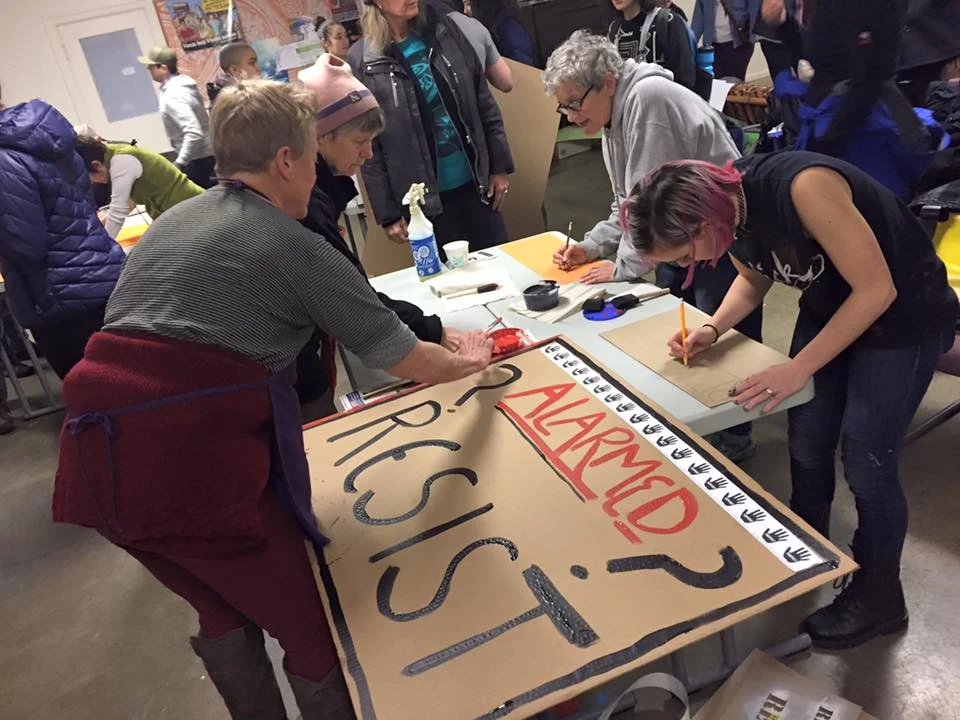 The night started with space for the Seattle Neighborhood Action Coalitions to create signs and banner for January 20th activities, shirt making for the Women's March on the 21st, and then created a ton of space for stencil making, screen printing, and creating posters. As the night progressed, people brought thousands of different sized posters, and food not bombs prepared food and wheatpaste, Project Wrongway: A Capitol Hill Sweatshop helped people sew patches on and of course included a Pussyhat Photobooth. Throughout the night, more than 200 people filtered in and out, packing the church basement rendering the dozens of tables, and every inch floor space into DIY arts and crafts centers.