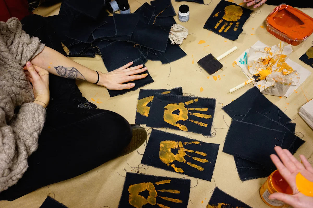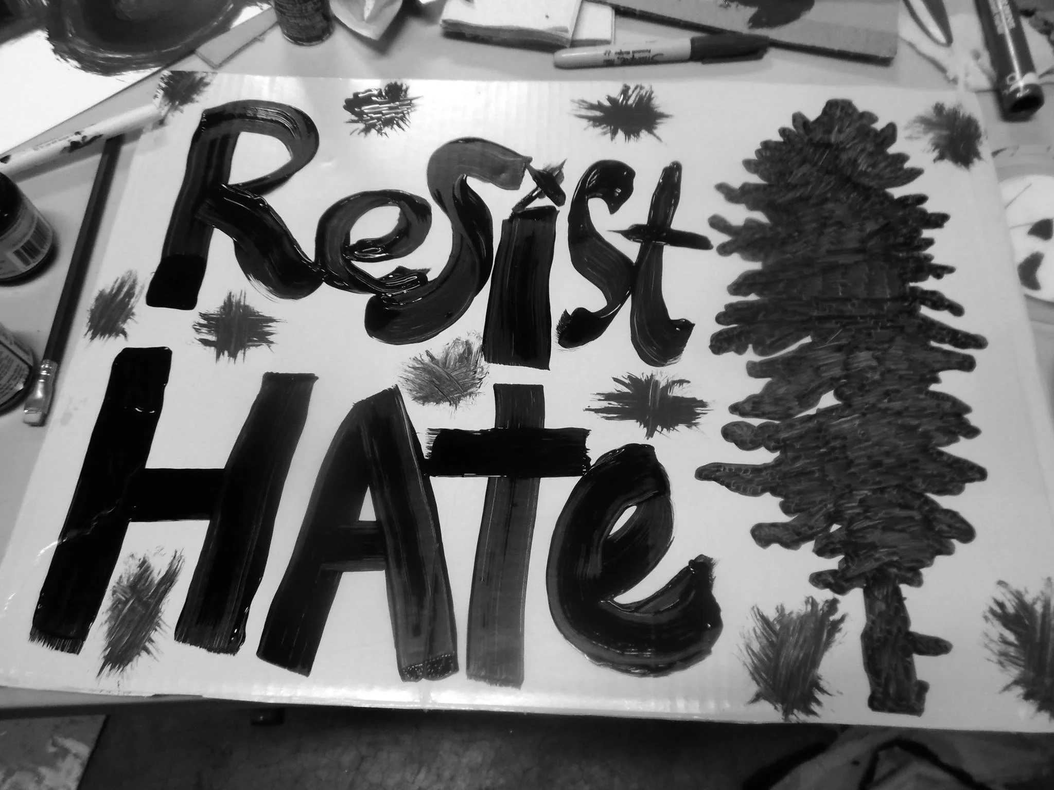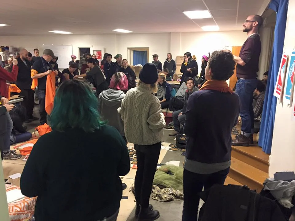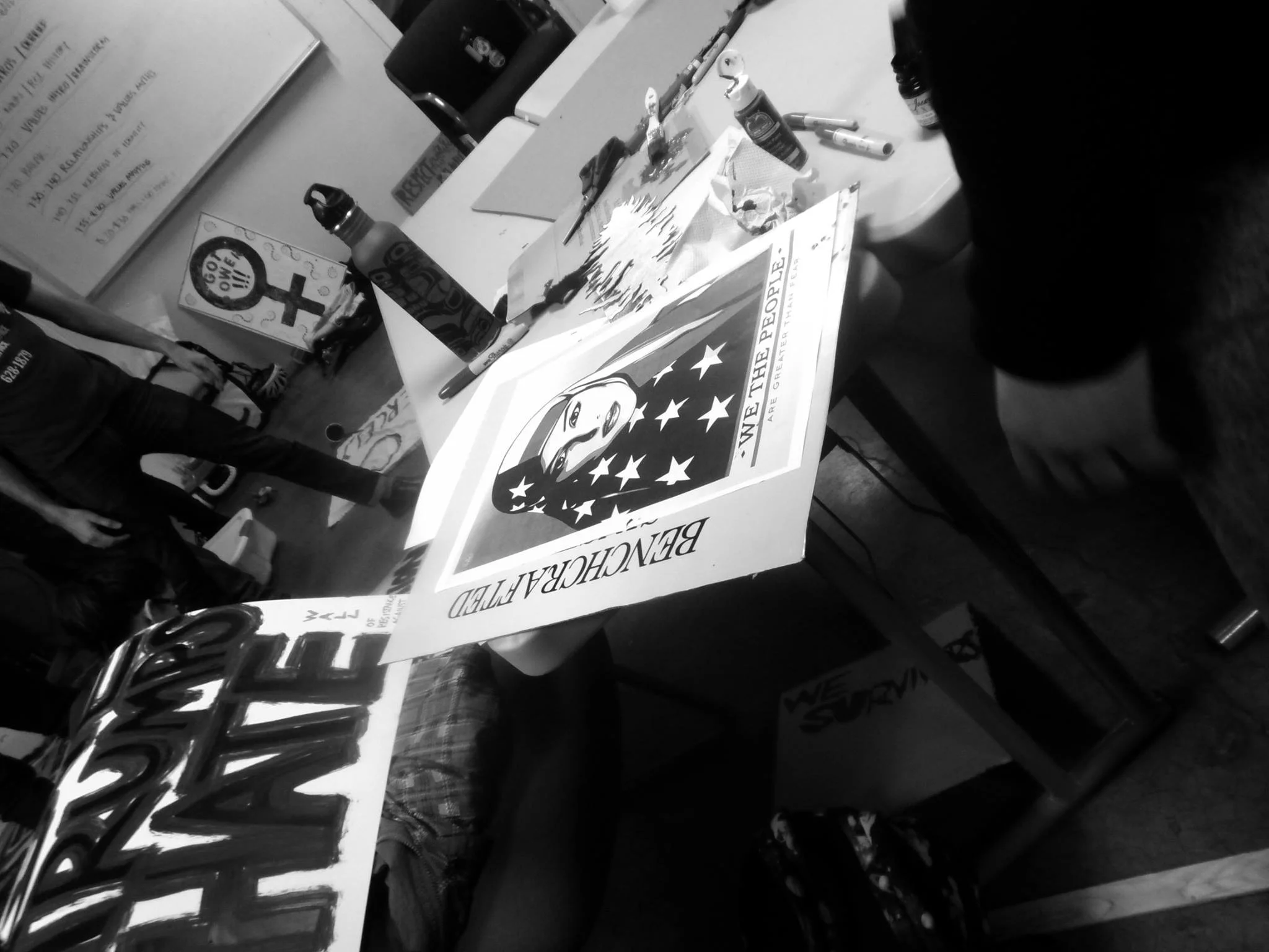 The night started with space for the Seattle Neighborhood Action Coalitions to create signs and banner for January 20th activities, shirt making for the Women's March on the 21st, and then created a ton of space for stencil making, screen printing, and creating posters. As the night progressed, people brought thousands of different sized posters, and food not bombs prepared food and wheatpaste, Project Wrongway: A Capitol Hill Sweatshop helped people sew patches on and of course included a Pussyhat Photobooth. Throughout the night, more than 200 people filtered in and out, packing the church basement rendering the dozens of tables, and every inch floor space into DIY arts and crafts centers.